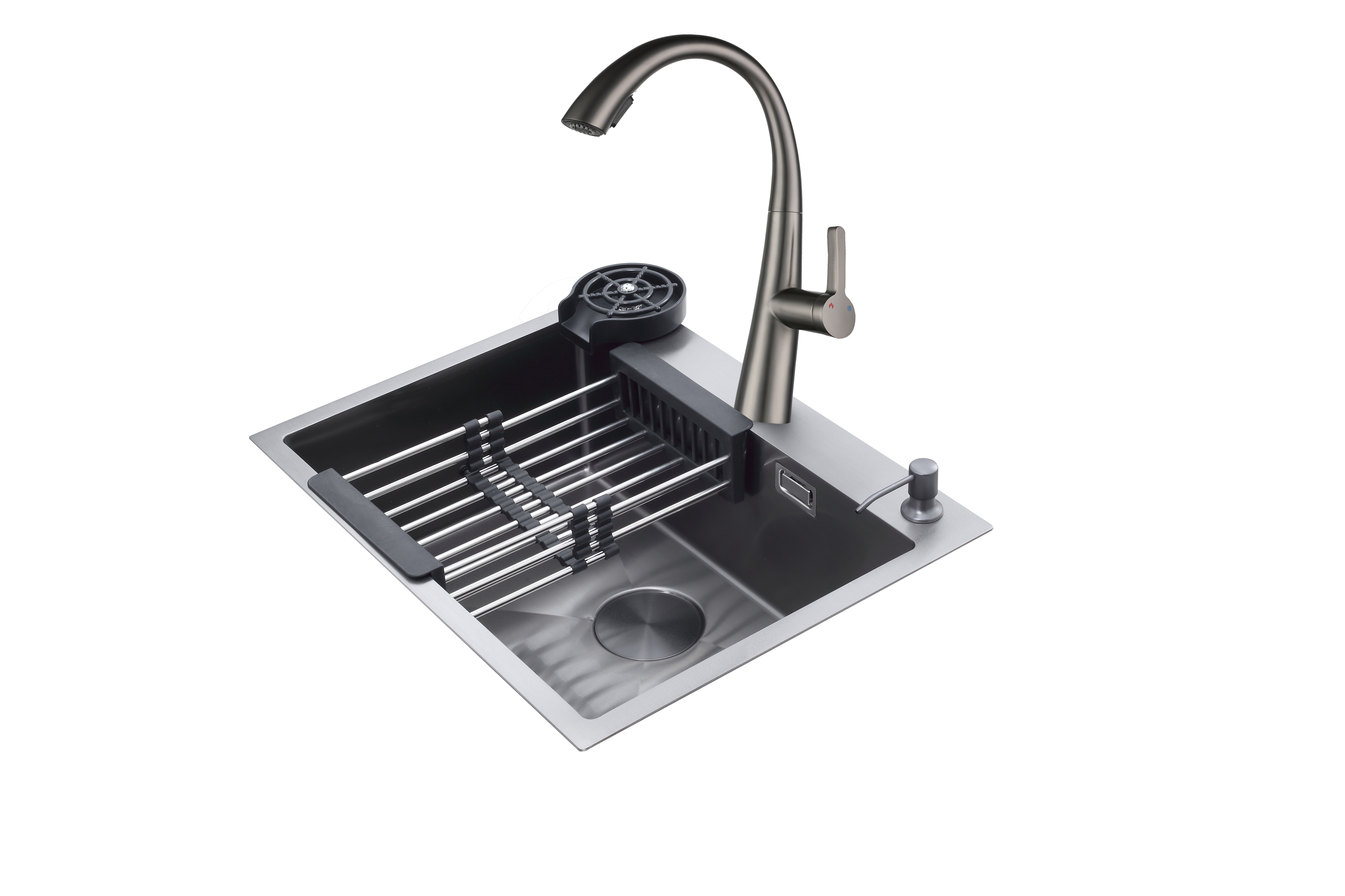 Fregador de 61cm de lujo, acero inoxidable satinado 304, espesor del borde 3mm. accesorios: drenajes y kit completo de instalación, cesta extraible en el drenaje, tapa de desague de lujo, escurridor de 114 mm con tubo de 1,5», griferÃa black de lujo monomando con manguera extraible, sistema antirreboso, sistema antiruido, enjuagador de vaso, dispensador de jabon de 500ml. medidas 610*482*220mm