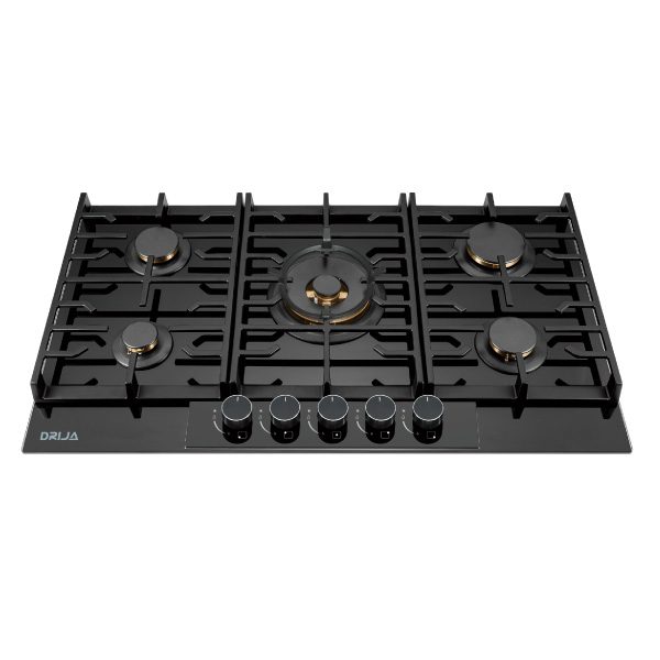 Estufa vitro gas, 87 cm, perillas de lujo y panel de vidrio con acero , 5 quemadores de cobre sabaf® 10 años de garantia, válvulas de seguridad, potencia 11,6kw, parrilla de hierro colado,1 porta wok, encendido electrico, voltaje 110v/240v