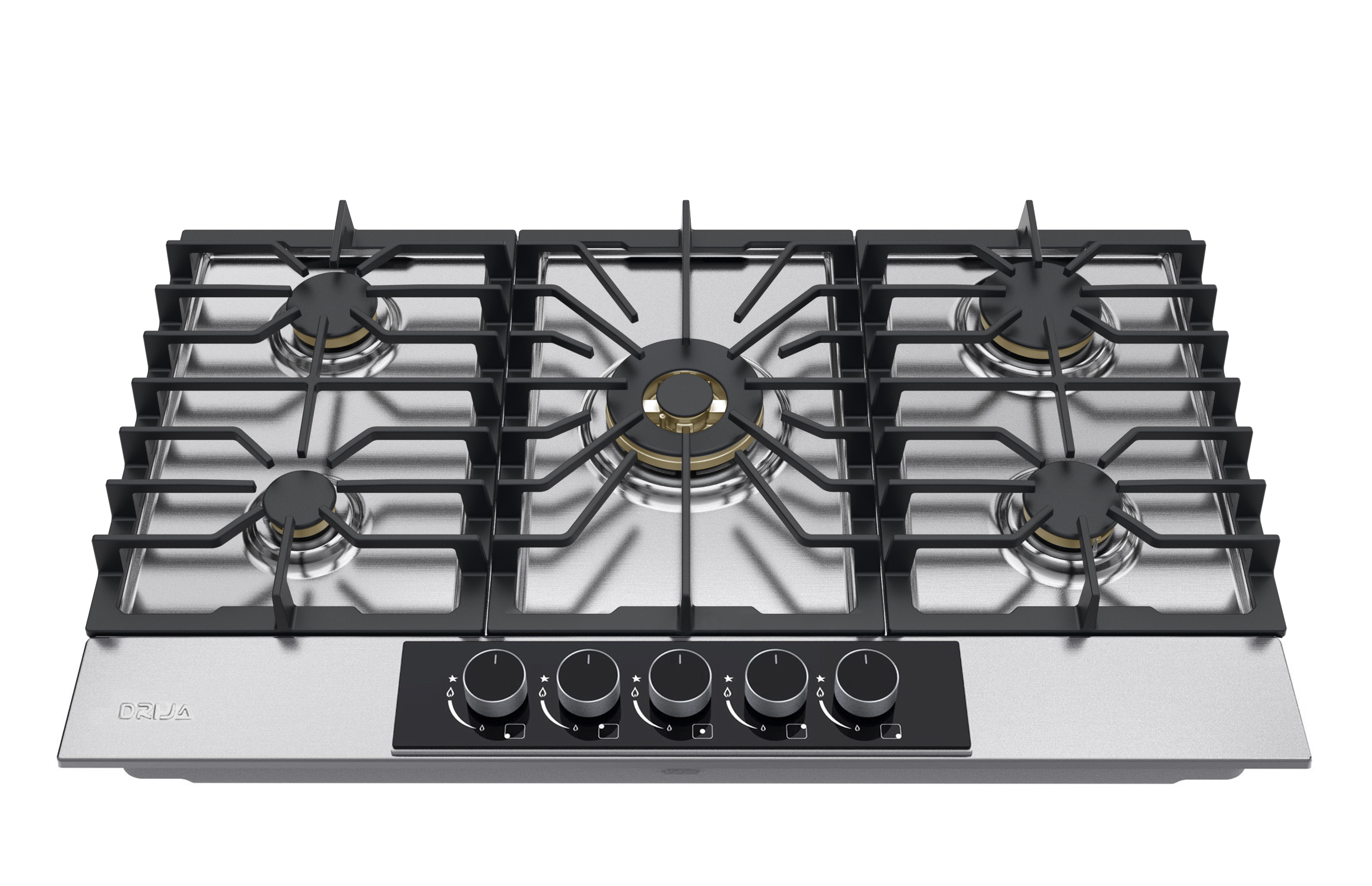 Estufa a gas acero inoxidable (304), 87 cm, perillas de lujo y panel de vidrio con acero ,5 quemadores de cobre sabaf® 10 años de garantia, válvulas de seguridad,potencia 11,6kw, parrillas de hierro colado, encendido electrico, voltaje de 110v/240v. incluye plancha de hierro fundido.