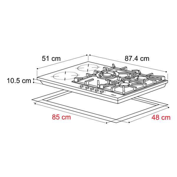 Estufa vitroceramica dual (gas y eléctrica), 87.4 cm perillas de lujo, valvula de seguridad, 1 quemador triple corona 3,4kw, 1 quemador auxiliar 1,0kw, 1 quemador semi-rapido 1,8kw, 1 quemador electrico vitro 1,2kw, 1 quemador electrico vitro 1,8kw, voltaje 220v